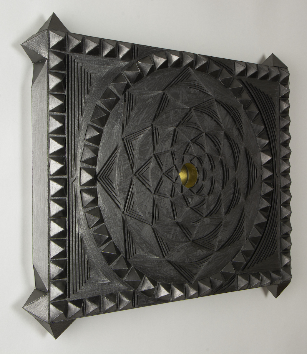 graphite, ink, metallic gouache, and Flashe on paper and wood construction